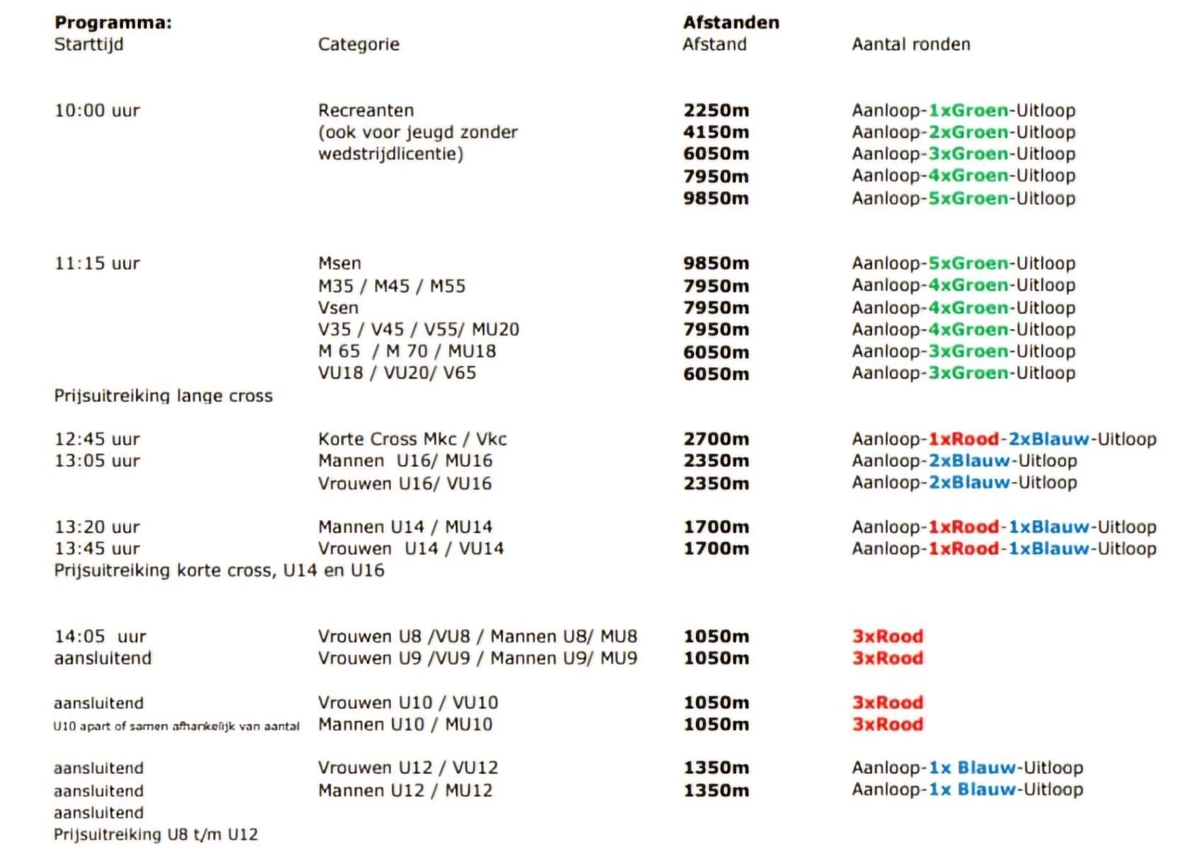 Op de wedstrijddag kunnen de startnummers opgehaald worden in onze kantine, waarvandaan de pijlen kunnen worden gevolgd naar de start van het parcours. Het is vanaf de kantine ongeveer 10 minuten wandelen naar de start van het parcours, hou daar rekening mee! Na het lopen van de cross kan het startnummer bij de kraam in het bos worden ingeleverd voor een warme chocolademelk!